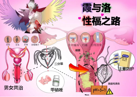 阴道毛滴虫仅有滋养体,呈梨形,前段有一个泡状核,核上缘有环状毛基体,由此发出4根前鞭毛和1根后鞭毛,体外测前1/2处有一波动膜。在本作品中不仅描绘了阴道毛滴虫的寄生部位(妇性阴道和男性泌尿生殖道)和以纵二分裂的繁殖的生活史,还表达了滴虫性阴道炎和尿道炎症状及简单的防治措施。旨在引起人们对阴道毛滴虫的关注,增加认知,从而注意个人卫生问题,避免引起感染及传播。