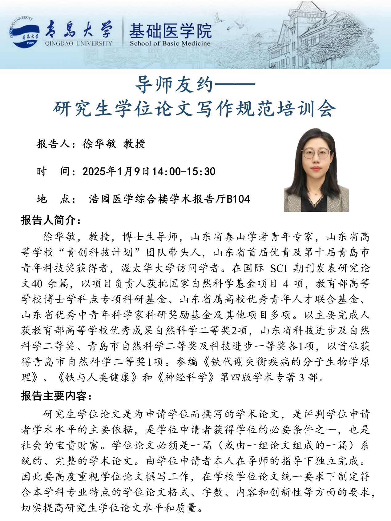 徐华敏教授结合国家和学校的相关文件及自身指导经验,向同学们详细讲解了研究生学位论文的各个方面。她从学位论文的基本要求、撰写格式与规范入手,帮助同学们理解如何规范地撰写学位论文。她特别强调了往年评审中专家反馈的主要问题,重点分析了学位论文的撰写原则与结构、实验设计、论文书写规范、参考文献的引用标准等内容。