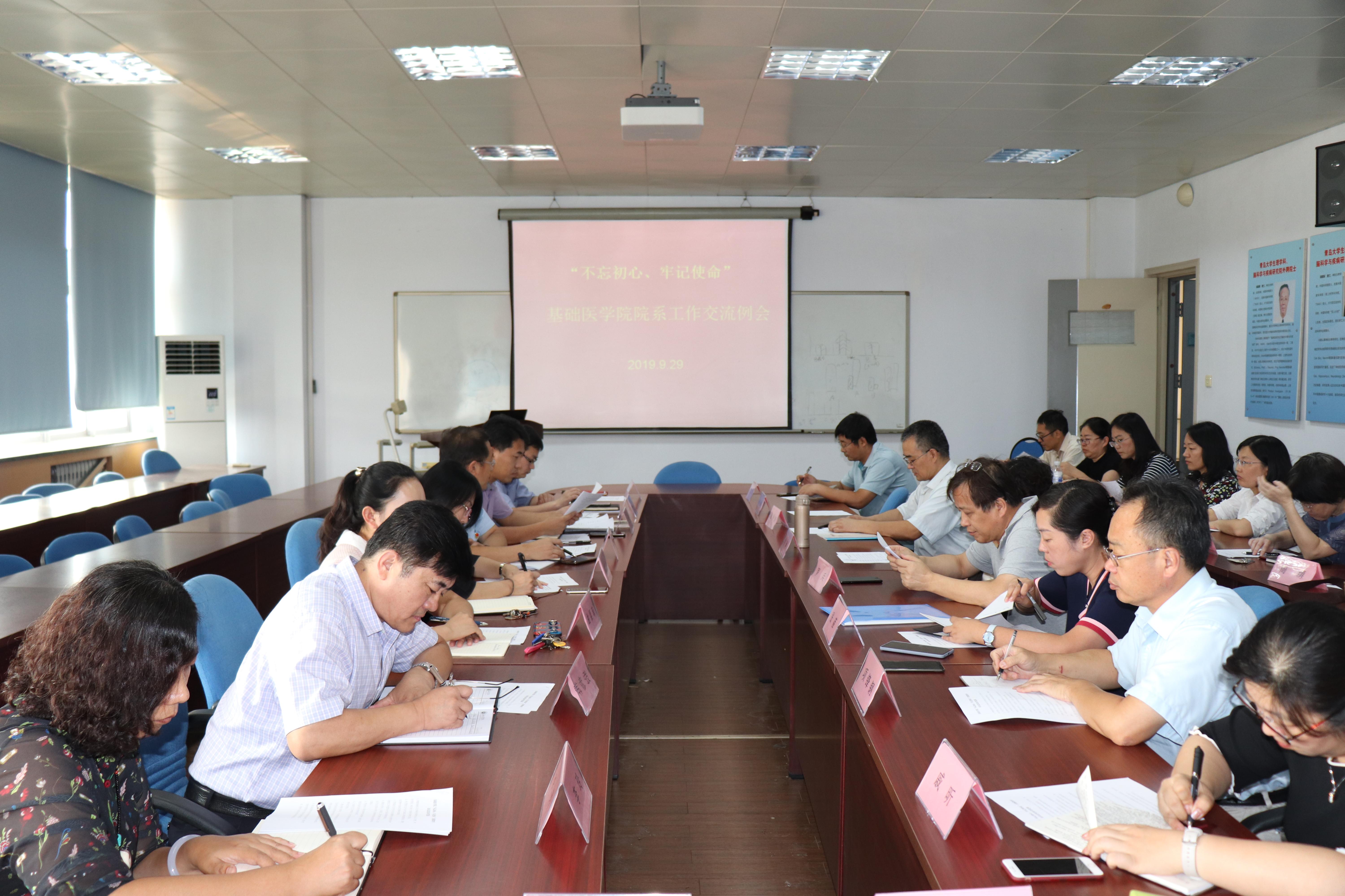 在博雅楼403会议室召开第四次院系交流工作例会,部署国庆前后安全工作,调度近期教学、科研、学科建设、临床医学专业认证等工作进展。并结合“不忘初心、牢记使命”主题教育,征求各学系、实验中心对学院发展和院领导班子的意见建议。学院领导宋佐东、王建勋、陈文芳、马泽刚、曲晨菲出席会议,各学系主任、副主任,各实验室、课程组和学科负责人,全体教工党支部书记,学院综合办负责人参加会议。会议由学院党委书记宋佐东主持。