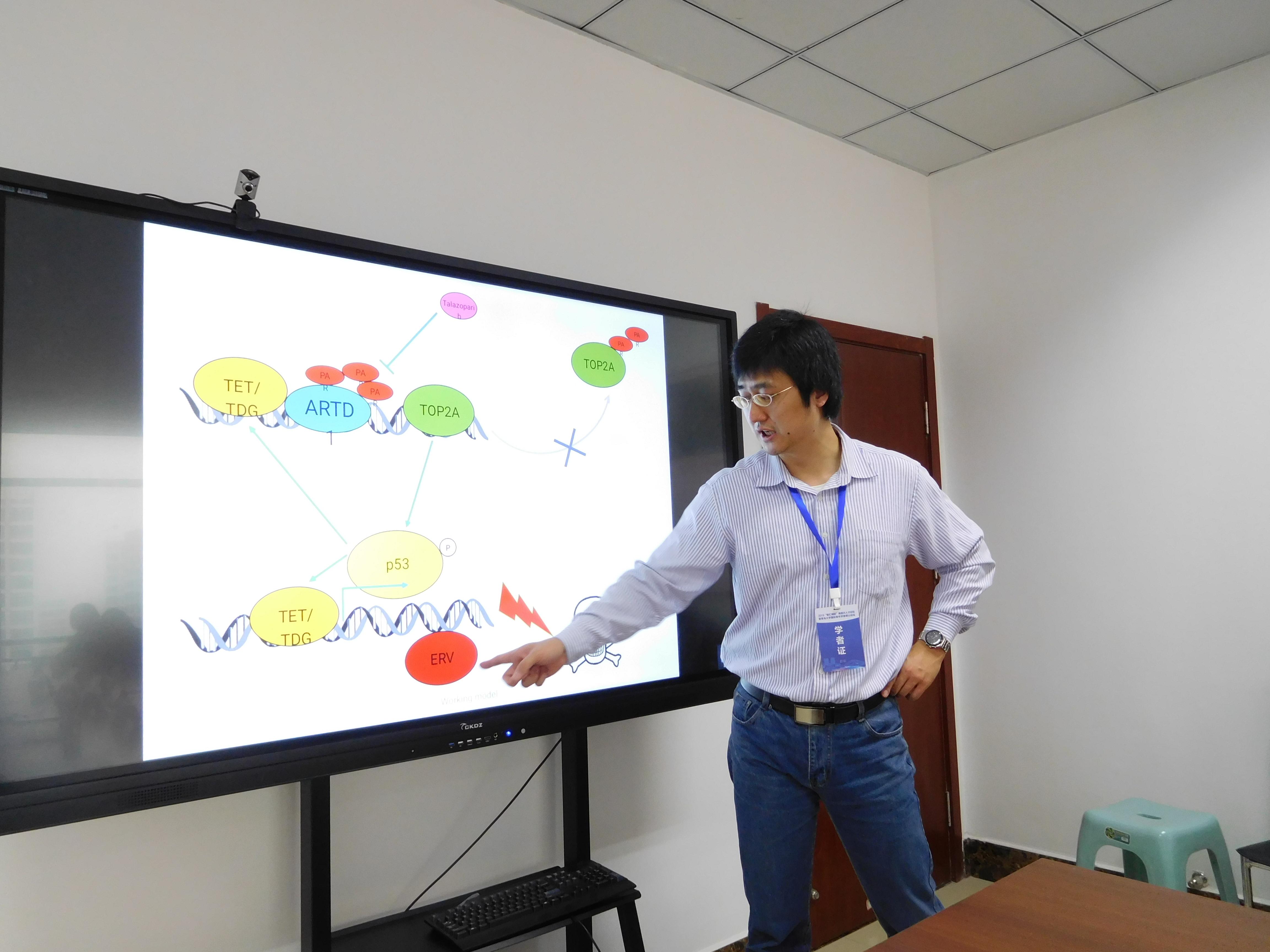 徐建明研究员作了题为“治疗乳腺癌的PARP小分子抑制剂”的报告,详细介绍了通过以老鼠的胚胎干细胞为模型研究PARP小分子抑制剂在干细胞中的作用机制,其研究成果对于PARP小分子抑制剂用于癌症精准治疗起到指导作用;高晓博士作了题为“NIP30, a REGγ inhibitor, accentuates anticancer sensitivity in p53-deficient tumor cells”的报告,高晓博士的研究揭示了细胞内一条新的通路CDC25A-NIP30-REGγ-P21,该信号通路能够在不依赖P53存在的情况下,对P21的蛋白质水平进行动态调控,从而实现对细胞周期、DNA损伤等生理情况下的调节;赵友宝博士则作了题为“新型隐球菌宿主环境适应机制”的学术报告。会议期间,学术报告引发参会师生的积极提问和热烈讨论,现场气氛活跃,学术交流氛围浓厚。