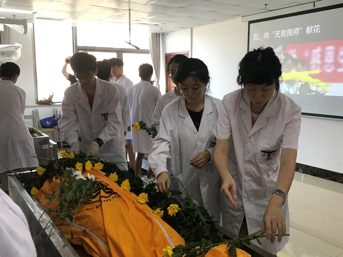 同学们手捧黄白菊花,满怀感恩与敬畏之心,肃立在“无言良师”遗体前。“解剖学誓词”宣誓结束后,师生向无言良师献花,全体人员静默1分钟。