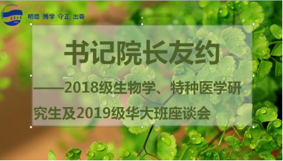在医学教育综合A楼110会议室召开本学期第二期“书记院长友约”座谈会。学院党委书记赵士平、院长王建勋、党委副书记刘学、院长助理李尚勇、辅导员谭雪梅及2018级生物学、特种医学研究生、2019级华大本科生代表参加了本次活动。