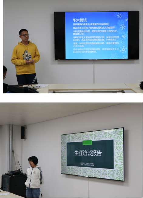 在前期的小组采访中,学长学姐从自身考研经历出发,围绕专业和院校选择、复习计划制定、心态调整等方面谈了自己的亲身体验和感受。他们认为,在考研过程中,心态是第一位的,一定要清晰认识考研的目的,对自己充满信心,坚持到底。学长学姐提醒低年级同学要尽早树立考研目标,早做复习准备,尤其强调了英语能力的重要性,不仅体现在考研英语中,还体现在考研复试的各个方面。交流会中,同学们利用PPT分享了小组访谈收获和思考。纷纷表示此次考研人物访谈和交流会,让自己对考研有了更多的了解和更清晰的认识,为今后的复习准备打下坚实的基础。
