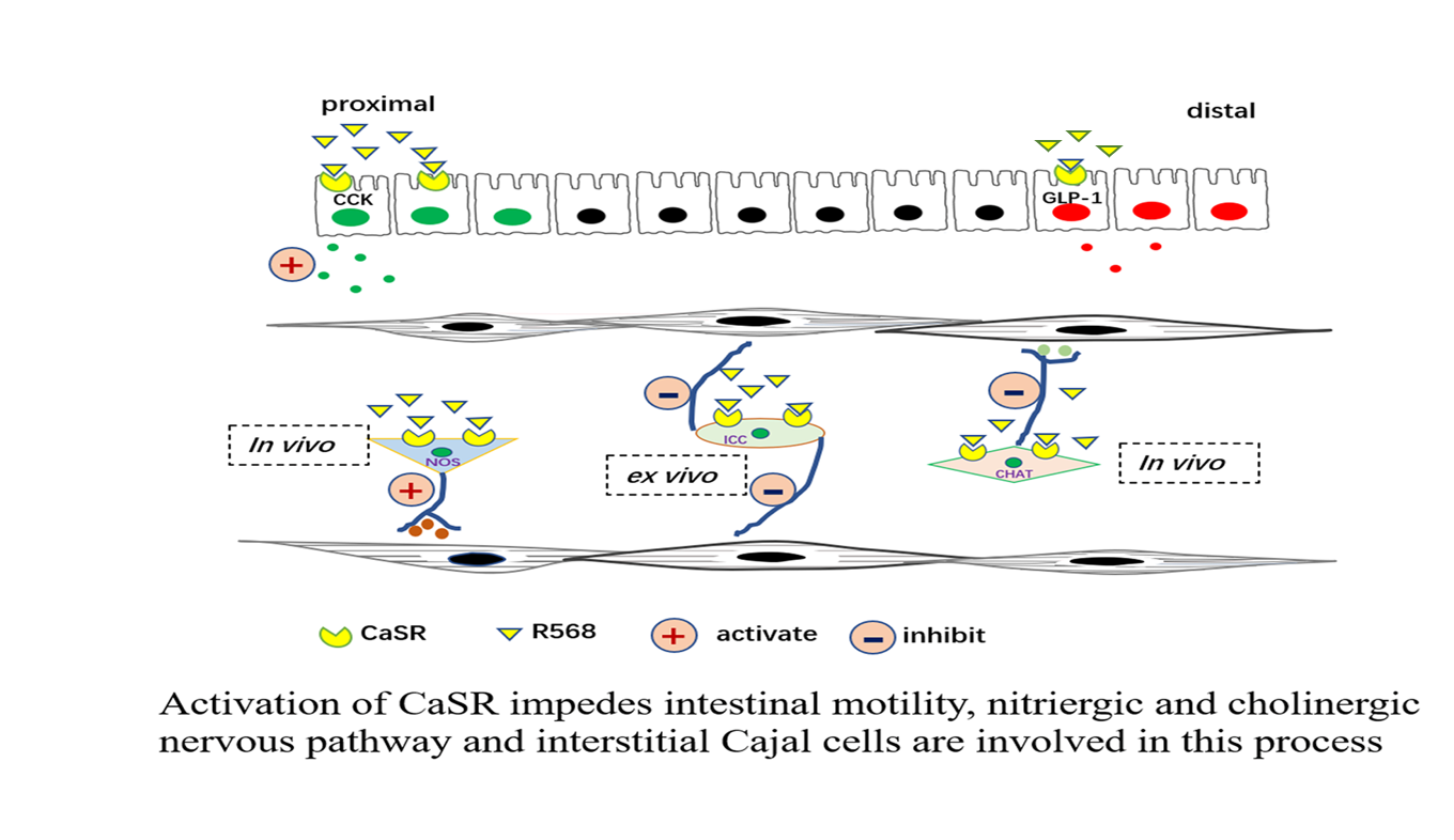 钙敏感受体作为一种营养受体,在胃肠道及中枢广泛分布,可被蛋白质代谢产物激活,参与胃肠激素分泌,胃肠道体液转运,神经元突触传递,神经元生长发育的调节。该研究通过在体和离体实验发现钙敏感受体在肠肌间神经丛高表达,其激活可以抑制肠道胆碱能神经系统而兴奋氮能神经系统,促进肠道激素CCK的分泌,同时影响肠道Cajal起搏细胞的活性,起到抑制肠运动的作用。该研究完善了蛋白质代谢产物参与胃肠功能调节的机制,为胃肠动力障碍性疾病的研究提供了新的研究方向。