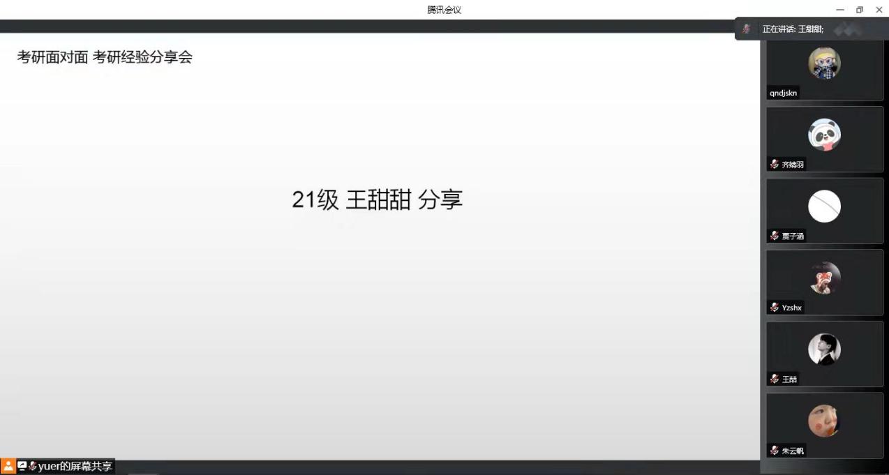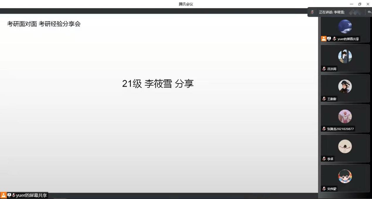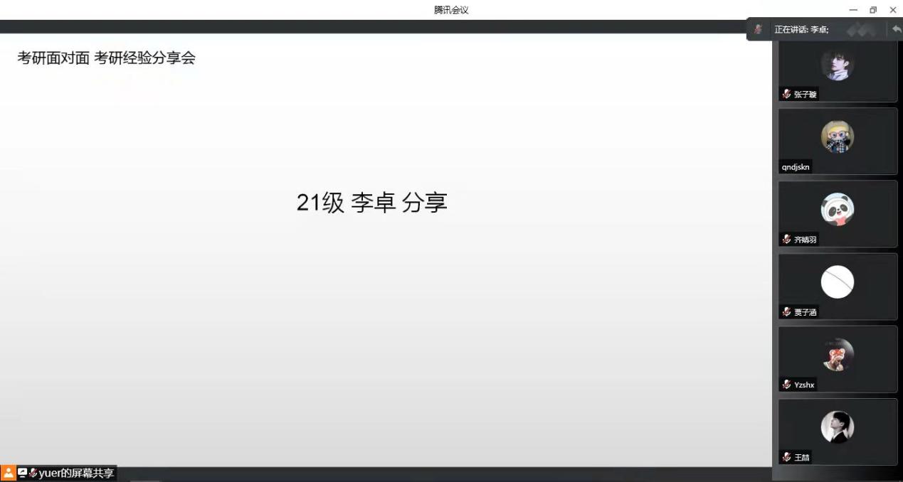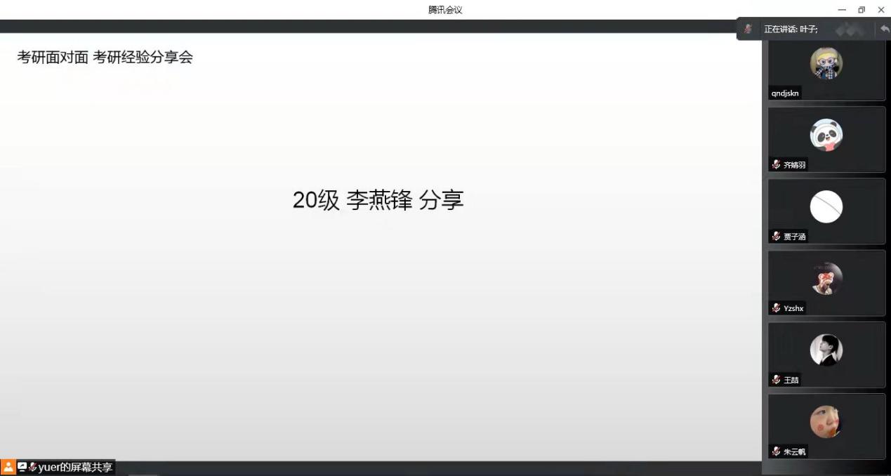 学生联合党支部的李燕锋同学向考研的师弟师妹们讲解了线上复试的大致流程。她对复试前调剂学校的选择进行了重点详细的介绍,并提醒各位师弟师妹们注意专业课的准备,在回答问题时要逻辑清晰,突出重点,要体现出自己分析问题、解决问题的能力。