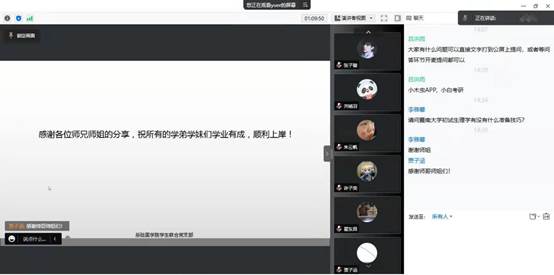 第二环节是提问环节,同学们通过直接开麦和公屏打字的方式踊跃提问,师兄师姐们都知无不言言无不尽,营造了良好的问答气氛。