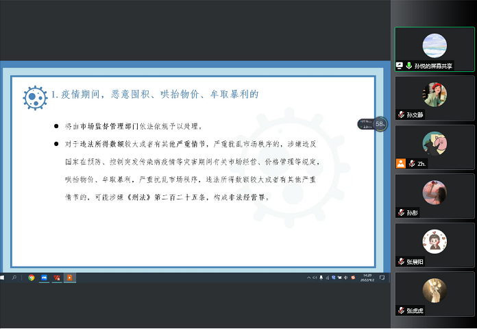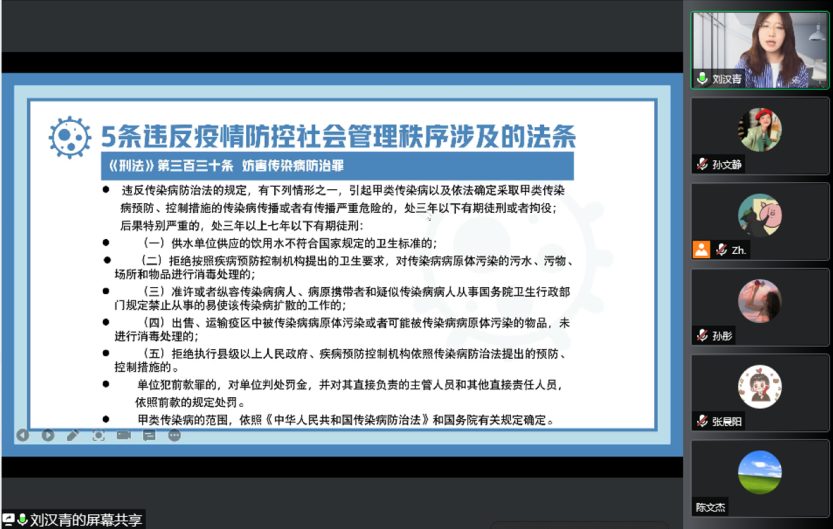 法学院学生第一党支部的刘汉青同学结合法律具体案例,为大家详细讲解了违反疫情防控社会管理秩序的行为,对防治“新型冠状病毒肺炎”涉及的法律知识进行了梳理并分享,加强了疫情防控法治宣传。希望大家提升法治意识、遵守相关法律法规,自觉配合和引导他人自觉配合有关部门做好疫情防控工作。