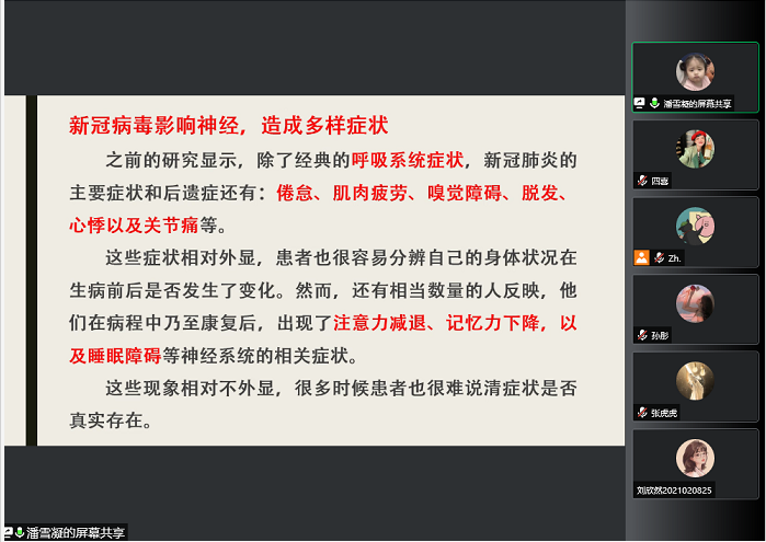 生物学研究生第二党支部的潘雪凝同学结合专业知识为大家讲解了新冠病毒与脑神经之间的关系以及病毒的传播途径,呼吁同学们在日常生活中能够做好防护措施,遵守校规校纪,平安健康地度过每一天。