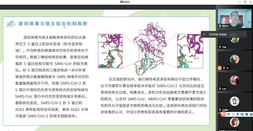 学生联合党支部的张彩顺围绕新冠病毒简介、预防措施、致敬最美逆行者以及疫情中的心理防护四大板块展开讲解,详细讲解了新冠病毒的结构与形态、抵抗力与传播途径。面对严峻形势,她呼吁大家要继承和弘扬伟大民族精神,以坚强意志打赢这场没有硝烟的战争。