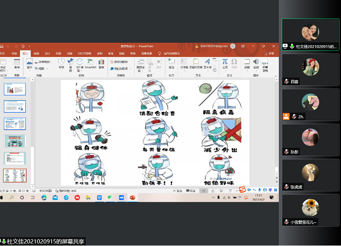 基础医学研究生党支部的杜文佳同学为大家讲解了变异毒株奥密克戎的知识以及如何正确使用口罩、手套、清洗手部以及日常消毒等疫情防护知识,希望同学们提高防控意识,做好个人防护与健康监测,应注意佩戴口罩,严格遵守学校管理规定。