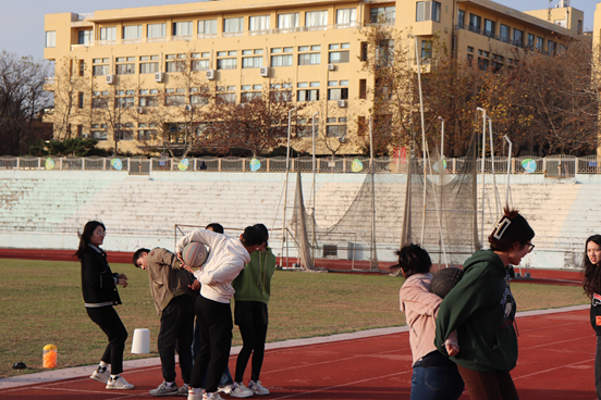 “螃蟹运球”要求大家“背对背”,与彼此一起夹着篮球,以可爱的螃蟹步在赛道上运球前行。