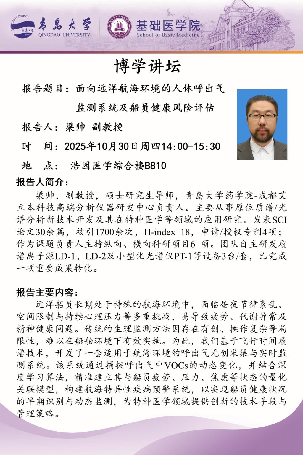 梁帅副教授聚焦远洋船员健康保障痛点,带来了一项适用于航海环境的健康监测技术创新成果。远洋船员因航海环境特殊,易受昼夜紊乱、空间受限、心理压力影响,引发疲劳、代谢异常及精神健康问题,而传统有创、复杂的生理监测方法难以在船上应用。为此,其团队基于质谱技术研发出呼出气无创采集与实时监测系统:通过捕捉呼出气中 VOCs 动态变化,结合深度学习算法,建立与船员特殊状态的量化模型。该技术填补航海无创健康监测空白,为特种医学的发展提供创新方案。