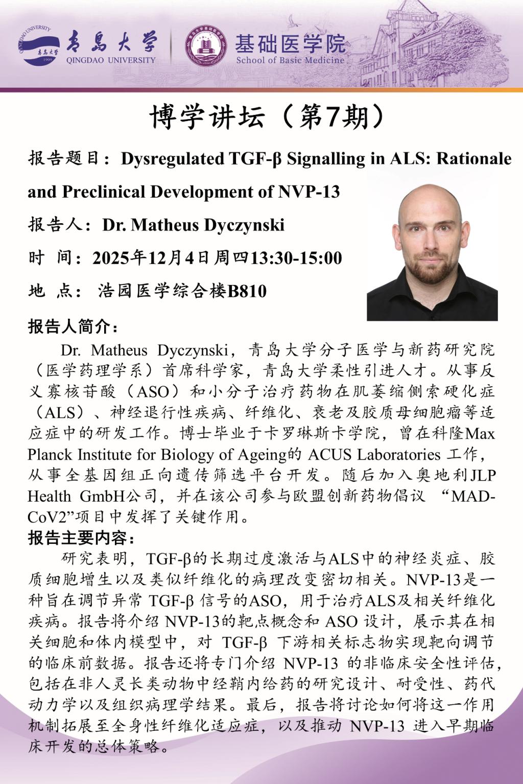 本期讲坛聚焦肌萎缩侧索硬化症(ALS)的创新药物研发,以“Dysregulated TGF-β Signalling in ALS: Rationale and Preclinical Development of NVP-13”为主题,Dr. Dyczynski结合自身在反义寡核苷酸(ASO)及小分子治疗药物领域的研究积累,围绕ALS的病理机制与创新候选药物NVP-13的研发展开深入解析。他指出,TGF-β信号的长期过度激活是ALS中神经炎症、胶质细胞增生及类纤维化病理改变的关键驱动因素之一,而NVP-13作为一款靶向调节异常TGF-β信号的ASO药物,为ALS及相关纤维化疾病的治疗开辟了新方向,兼具重要的临床转化价值与学术研究意义。