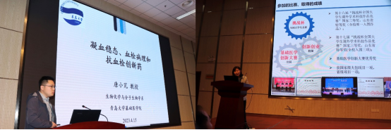 唐小芃教授“凝血稳态、血栓病理和抗血栓新药”、赵文文副教授“大学生创新创业带教经验分享”的专题报告。唐教授主要从事凝血稳态调控分子机理和血栓疾病发病机理研究以及低出血风险抗血栓药物研发并取得了一系列重要原创性研究成果。赵文文副教授在报告中鼓励大学生早进实验室,进行科研锻炼,积极参加各种大学生的科创比赛,增加科研经历培养科研素养等。