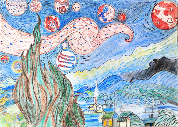 作品说明:这幅画将梵高的《星夜》元素与人体解剖学相结合,呈现出一幅充满科学性和创新性的画面。画面中心以旋涡状的植物为主体,象征着生命的活力与循环,而周围散布的球体则绘制出消化系统的重要器官,如食道、肝、胃等,展示了人体内部的复杂与精密。星空背景的加入,不仅增强了画面的空间感,还寓意着对人体奥秘的无限探索与敬畏。这幅作品通过科学与艺术的融合,表达了对生命与自然的深刻理解,以及对未知世界的向往与追求。