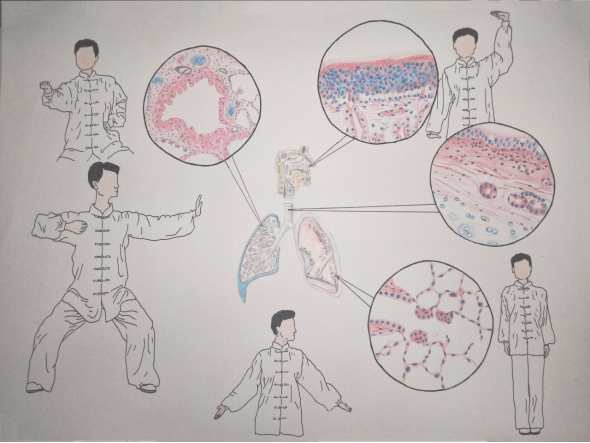 作品说明:八段锦气功历史悠久,如今备受大众喜爱,不仅有助于强身健体,还能平衡身心。其中,调整呼吸被认为是其最重要的一环。正确的呼吸方式配合八段锦练习,可以更好地发挥功法效果。本作品将八段锦与呼吸系统联系起来,通过描绘部分招式和呼吸系统的结构,特别是鼻腔嗅黏膜、气管、细支气管和肺泡的光镜结构,旨在展现八段锦与呼吸系统之间密切的关联,以及调整气息对身体的重要作用。