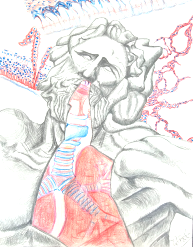 作品说明:拉奥孔出自希腊神话中特洛伊之战的故事,因拉奥孔告诫特洛伊人勿将木马拖入特洛伊,而遭到希腊保护神派出的巨蛇咬死。本作品想象了拉奥孔被绞杀时呼出奄奄气息的模样,运用了素描技法,并用彩铅表现了其呼吸系统的宏观图样。背景中绘制了嗅黏膜、气管、肺的HE染色图,表现了呼吸系统的围观图样。 |
