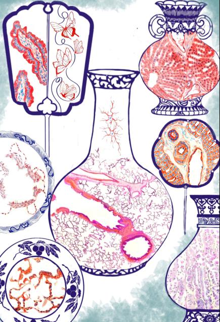 作品说明:“白釉青花一火成,花从釉里透分明”,非遗青花瓷是中华文化传统瓷器之一,也是青出于蓝的600年中国瑰宝。本作品选取小肠上皮,肝小叶,肺,胃底腺,呼吸性细支气管等组胚切片,将其绘制于青花瓷,团扇等之中,不仅以一种别致的形式展示了组胚之美,医学之美,也实现了中国优秀传统文化与医学知识之间的美好融合。本作品绘图精细,色彩丰富,致力还原出显微镜下的美妙世界。当肺泡构成青花瓷的裂纹,当肝小叶形成青花瓷中的一抹花纹,这又何尝不是一种理科艺术与文化美感的极致碰撞呢。