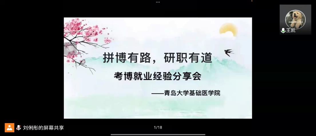 基础医学党支部组织开展了以“拼搏有路,研路有你”为主题的考博就业经验分享会。本次分享会采用线上形式,邀请学院成功考取博士研究生和就业的4位同学参加。党支部副书记刘俐彤主持此次分享会。