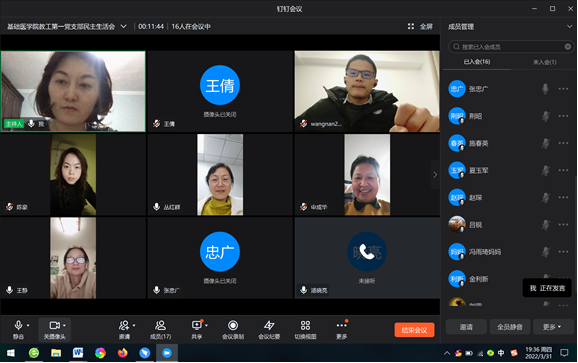 2022年3月31日晚7点半,教工第一党支部17名党员利用钉钉会议和微信,召开了特殊时期的组织生活会。支部书记张丽对支部的全体党员恪守职责和无私奉献表示崇高的敬意和由衷的感谢,要求全体党员认真学习党的路线方针政策,在教学、科研和学生培养等方面继续发挥先锋模范作用。学院丛红群书记简单介绍了疫情期间学院和支部的工作及坚持在抗疫一线的老师的工作情况,对男同性恋av