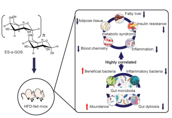 肠道微生物的组成在高脂饮食(HFD)及其相关代谢综合征(MetS)诱导的肥胖中具有重要作用。该研究利用高脂诱导的小鼠肥胖模型,研究酶法合成的α-半乳低聚糖(ES-α-GOSs)对HFD喂养小鼠的MetS和肠道菌群失调的影响,并进一步研究MetS的减弱是否与肠道菌群的调节有关。其结果表明ES-α-GOS可以显著改善肥胖相关的代谢综合征,包括高脂血症、胰岛素抵抗和轻度炎症。随后的肠道菌群分析进一步表明,补充ES-α-GOS可显著调节肠道菌群的总体组成,并逆转HFD喂养引起的肠道菌群紊乱。该研究证明了ES-α-GOSs可以作为一种潜在的候选药物,可通过调节肠道微生物群来预防肥胖诱导的代谢综合征。