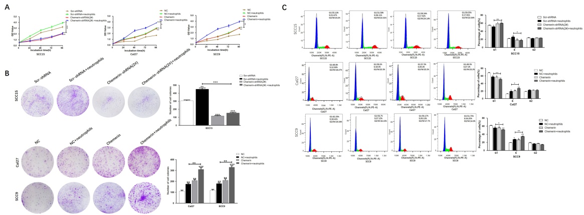 在肿瘤微环境中,肿瘤相关中性粒细胞可能会影响肿瘤的生长、侵袭和转移等。该研究利用免疫组化、共培养、transwell等方法研究了舌鳞癌组织中Chemerin的表达与中性粒细胞浸润的关系以及二者和病人临床病理参数的关系。同时体外实验中探索了中性粒细胞和Chemerin表达对舌鳞癌细胞系(Cal27,SCC9和SCC5)功能的影响及可能分子机制。结果发现:舌鳞癌组织中Chemerin的表达可以增加中性粒细胞的浸润,并且二者与病人不良的临床结局有关。体外实验表明:中性粒细胞可以通过Chemerin促进舌癌细胞的增殖、侵袭和迁移以及EMT的发生。同时可以激活JAK2/STAT3信号通路并上调其下游Phospho-Rb, E2F1, CyclinE1, and CyclinD1.等基因。总之该研究提示:Chemerin表达和中性粒细胞浸润在舌癌的演进过程中发挥了重要的作用。