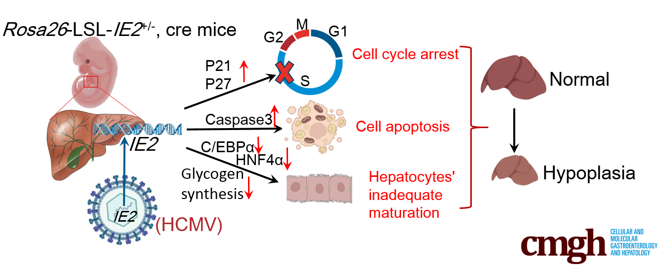 人类巨细胞病毒(HCMV)是先天性感染的最常见病毒,影响0.4%-1%的活产婴儿。HCMV感染是导致出生缺陷的主要原因,包括肝损伤、听力和视力丧失、神经功能缺损和宫内生长迟缓,甚至导致早产和死产等不良后果。IE2是HCMV的主要即刻早期蛋白,对HCMV感染的进展至关重要。由于物种隔离,目前还没有成功的HCMV感染的动物模型去研究IE2对胚胎肝脏发育的长期影响。因此,本研究通过构建转基因小鼠模型,探讨了IE2在胚胎肝脏发育过程中的作用及其机制。结果表明新构建的Rosa26-LSL-IE2+/−, cre小鼠能够在胚胎肝脏发育中的不同阶段持续表达IE2。随着,Rosa26-LSL-IE2+/−, cre胚胎的发育,胚胎从第17.5天(E17.5)到出生后第1天(D1)的出现进行性肝发育不良和胚胎死亡。此外,本研究还提供了IE2的表达能够抑制肝细胞增殖、增加细胞凋亡和损害肝细胞成熟的分子证据。本研究证明了IE2的表达通过扰乱肝脏形态发生和肝细胞成熟而导致胚胎肝脏发育不良,这可能是胚胎死亡的原因。本研究为进一步阐明HCMV感染细胞的潜在分子机制以及开发新策略以克服肝脏发育过程中的相关病理学提供了宝贵的资源。