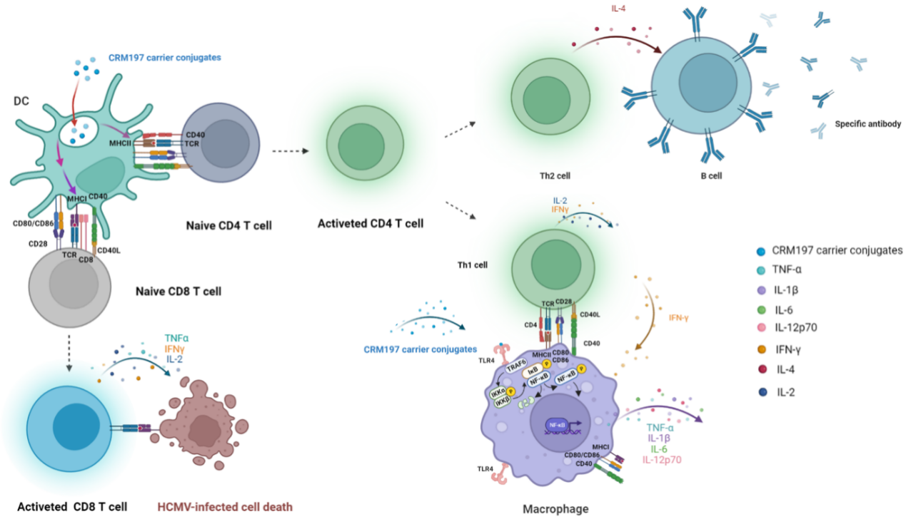 人巨细胞病毒(HCMV)感染是新生儿神经发育障碍和器官移植严重并发症的主要原因。以往的HCMV疫苗侧重于体液免疫,但对病毒感染的抑制效果有限。T细胞反应对于预防HCMV感染至关重要,这表明有效的疫苗需要激活T细胞。在这项研究中,我们设计了一种与CRM197载体蛋白偶联的新型多肽疫苗,编码来自HCMV的gB287-320和pp150311-325中的15个CD8+T细胞表位、5个CD4+T细胞表位和4个B细胞表位,诱导T细胞免疫应答。为了评估疫苗的有效性,我们随后测量了来自体内和体外抗原提呈递细胞的表面分子标志和促炎细胞因子的表达,以及T细胞和抗体的活化。结果表明,该多肽疫苗可以通过TLR4/NF-κB途径激活先天免疫,包括上调MHCI、II、CD80、CD86和细胞因子表达。同时,疫苗接种引起有效的中和抗体和细胞免疫反应,产生TNF-α,INF-γ和IL-2,表明向Th1极化。这一发现强调了CRM197结合的多肽疫苗促进体液和细胞免疫的协同作用,提供了对HCMV的增强保护,这可能是预防HCMV相关疾病的潜在策略。