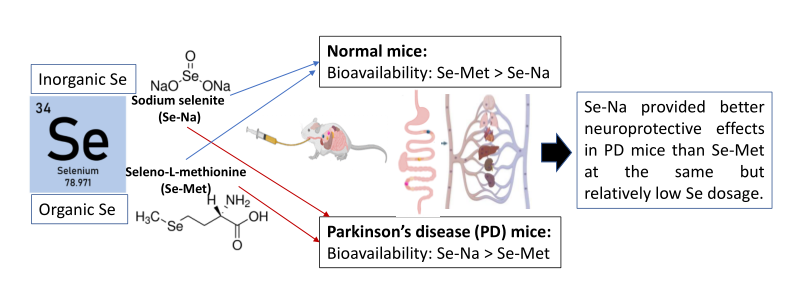 硒(Se)是一种重要的抗氧化微量元素,已被证明对治疗帕金森病(Parkinson’s disease, PD)有效果,但不同形式的Se对PD的作用仍不清楚。将不同剂量的无机亚硒酸钠(Se-Na)或有机硒-L-蛋氨酸(Se-Met)作用于MPTP诱导的急性或慢性PD小鼠模型,探讨其对多巴胺能神经元的保护作用及机制。研究发现,在相同且相对较低的硒剂量下,Se-Na对PD小鼠的神经保护作用优于Se-Met。Se-Na较Se-Met相比,增强了PD小鼠的GPX蛋白活性,但对其mRNA表达没有影响,这可能是无机硒能够治疗多巴胺能神经元退行机制的主要原因。体内生物分布实验发现,注射MPTP极大地改变了小鼠体内硒的生物分布,导致Se-Na和Se-Met的生物利用度发生逆转。Se-Na在PD小鼠中的生物利用度高于Se-Met,证明了Se-Na比Se-Met更好的神经保护作用。我们的研究结果证明,硒的形式和剂量对PD小鼠模型的生物学行为起决定作用。我们的研究将为研究人员和/或医学专业人员使用硒治疗帕金森病提供有价值的科学证据。