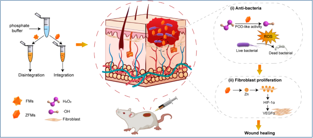 本研究报道了一种微量Zn调控的Fe-MOFs(ZFMs)纳米酶,它被设计为一种稳定和高效的ROS产生装置,以促进细菌感染的伤口愈合。所制备的ZFMs伤口敷料可以保证在生理条件(pH 7.4)下的长期稳定性,同时可以避免金属离子大量释放引起的组织毒性。此外,体外实验证明ZFMs具有良好的POD样活性,微量ZFMs(150 μg mL-1)对产生超广谱β-内酰胺酶(ESBL)的大肠杆菌有98%的致死率。而传统的Fe-MOFs仅在高浓度条件下(>500 μg mL-1)下才有显著的杀菌作用。同时,Zn可以降低FMs的毒性,上调VEGFα的表达,促进成纤维细胞的增殖,该研究为实现伤口的加速愈合和快速消毒提供了新途径。