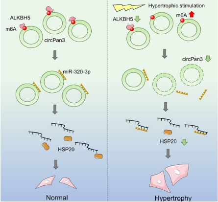该研究发现环形RNA-circPan3具有抑制病理性心肌肥大的功能。体外实验结果显示,在心肌细胞内circPan3可充当miR-320-3p海绵,抵消miR-320-3p对心肌保护蛋白HSP20的表达抑制作用。当心肌细胞受到异丙肾上腺素(ISO)刺激时,胞内去甲基化酶ALKBH5表达下降,使circPan3分子因受m6A修饰而降解,最终导致HSP20表达受阻,引起心肌细胞表面积增大、以及病理性心肌肥大标志物ANP、BNP和β-MHC的高表达。动物实验结果显示,以circPan3-AAV感染小鼠心肌补充内源性circPan3,可抑制ISO所引起的心肌组织中的HSP20表达下调,显著缓解ISO引起的病理性心肌肥大及心功能损伤。上述发现阐明了circPan3在病理性心肌肥大发病过程中的功能和作用机理,揭示了在病理性心肌肥大中由ALKBH5/circPan3/miR-320-3p/HSP20构成的调节调节通路,为心脏疾病的治疗提供了新靶点。