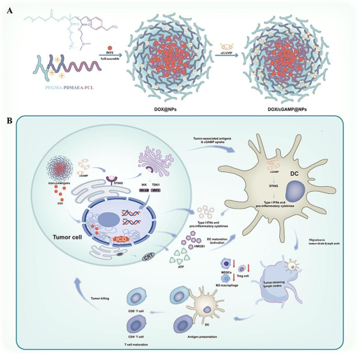 阿霉素(DOX)可诱导免疫原性细胞死亡(ICD),导致肿瘤相关分子模式(DAMPs)和肿瘤相关抗原的释放。这一过程可促进树突状细胞(DCs)成熟和细胞毒性T淋巴细胞浸润。但是癌细胞可通过多种机制来逃避宿主免疫系统。最近的研究表明,干扰素基因激动剂,如cGAMP,可以放大ICD触发的免疫应答,增强免疫细胞浸润。因此构建了DOX和cGAMP共递送系统(DOX/cGAMP@ NPs)治疗黑色素瘤和三阴性乳腺癌。结果表明,DOX能有效地杀伤肿瘤细胞,并通过ICD诱导DAMPs的释放。体内结果表明cGAMP可通过诱导I型干扰素和促炎细胞因子的分泌,促进DCs的成熟和CD 8+T细胞的活化和浸润,增强DOX诱导的抗肿瘤免疫应答,还有效缓解免疫抑制性肿瘤微环境。该研究证明了联合DOX和cGAMP的策略对未来的研究和临床应用具有重要意义。