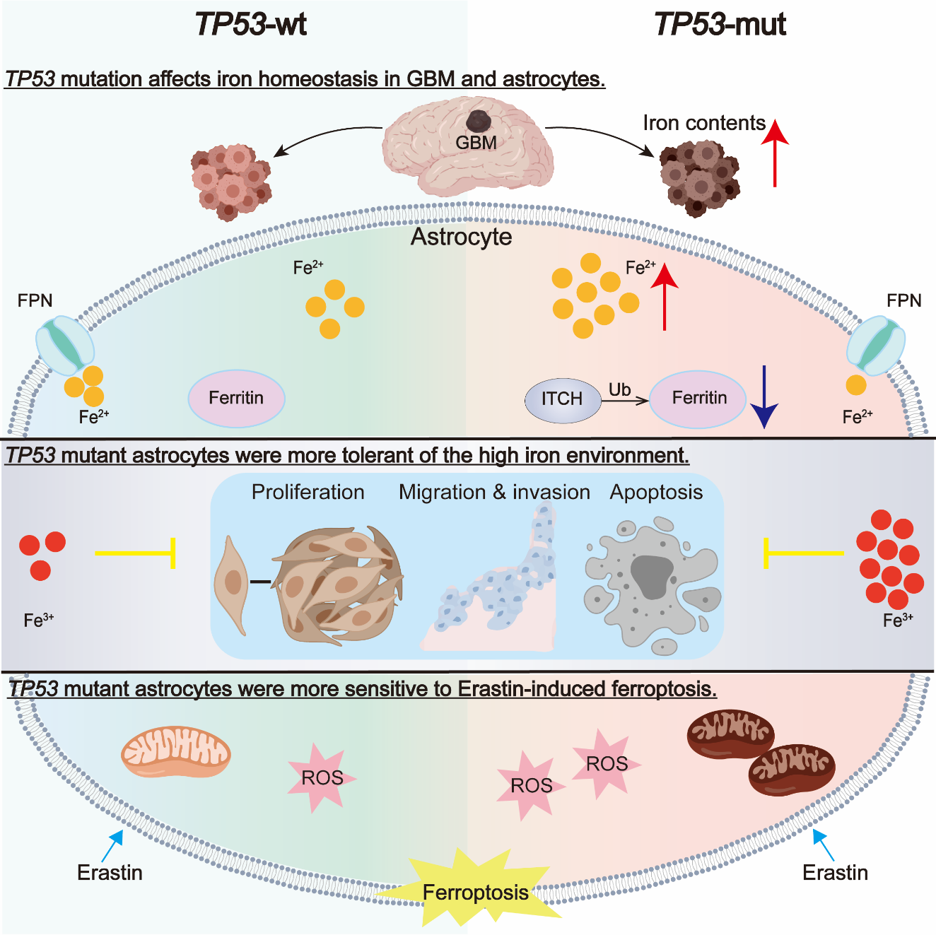 铁代谢是肿瘤发生和发展的关键因素,TP53突变可降低胶质母细胞瘤患者放疗和化疗的有效性,促进肿瘤进展。但TP53突变在胶质母细胞瘤中调控铁代谢的机制尚不明确。本研究通过对TCGA数据库分析揭示了胶质母细胞瘤中铁稳态失衡的现象。进一步对患者组织检测发现,TP53突变型胶质母细胞瘤中总铁水平升高,铁蛋白水平降低。具体机制表现为TP53突变的功能获得效应上调星形胶质细胞中E3泛素连接酶ITCH的表达,导致铁蛋白降解和游离铁水平增加。TP53突变型星形胶质细胞对枸橼酸铁铵诱导的高铁环境具有更强的耐受性,但细胞内游离铁的增加使其对Erastin诱导的铁死亡更敏感。此外,枸橼酸铁铵与Erastin联合使用显著增加TP53突变型星形胶质细胞的铁死亡水平。本研究阐明了TP53突变影响胶质母细胞瘤铁稳态,并为TP53突变型胶质母细胞瘤患者的药物研发和治疗提供了新的思路。