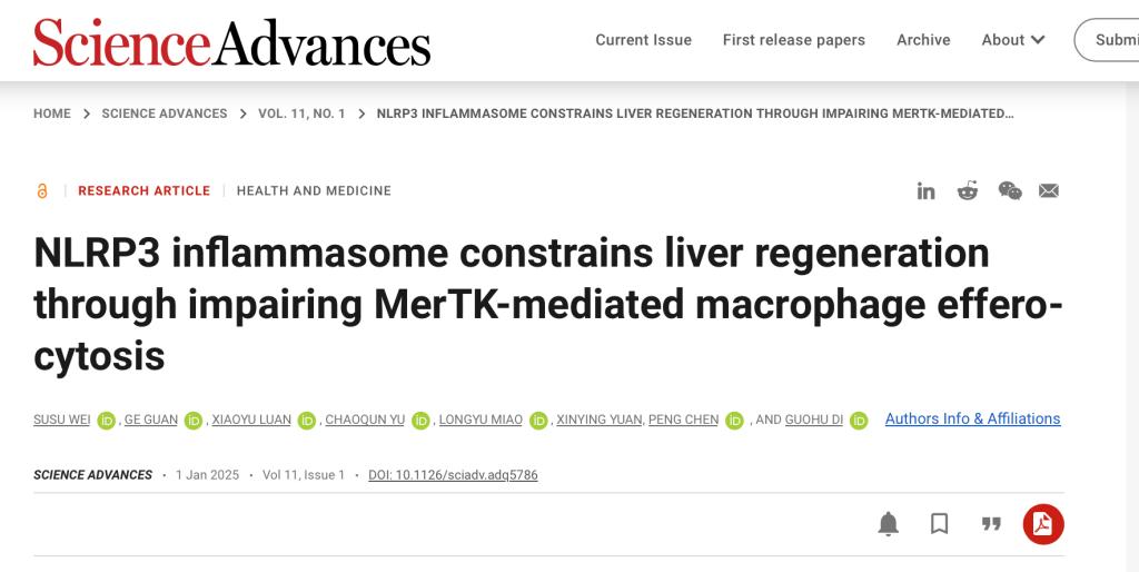 狄国虎、陈鹏教授课题组在Science子刊ScienceAdvances杂志在线发表了题为“NLRP3 Inflammasome Constrains Liver Regeneration Through Impairing MerTK Mediated Macrophage Efferocytosis”的研究论文(IF=11.7,DOI: 10.1126/sciadv.adq5786)。该研究揭示了巨噬细胞NLRP3炎症小体在调控肝脏再生中的重要作用,并为靶向NLRP3提供了新的治疗策略。2020级特种医学硕士研究生韦素素(现就职于齐鲁中科现代微生物技术研究院),男同性恋av
