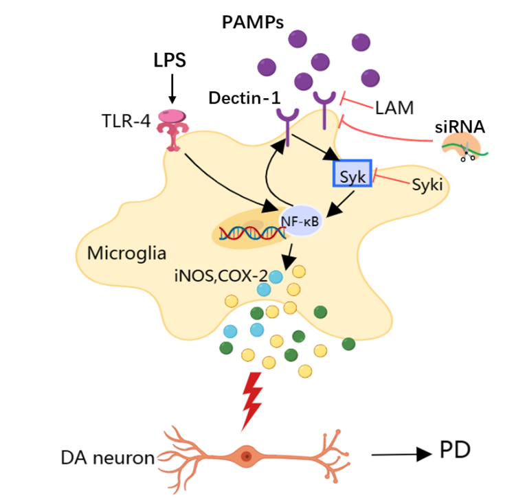 本研究应用小胶质细胞炎症模型和帕金森病(PD)小鼠炎症模型,结合药理学阻断、基因沉默、染色质免疫共沉淀等技术,从C型凝集素受体Dectin-1和Toll样受体TLR4参与PD炎症反应的机制入手,阐明了Dectin-1参与中脑黑质区小胶质细胞炎症反应及其可能机制,Dectin-1拮抗剂Laminarin通过抑制TLR4-NF-κB和Syk/NF-κB信号通路的激活,促进小胶质细胞从M1表型向M2表型转化,发挥其对DA能神经元的保护作用,提示Dectin-1可能是治疗PD的潜在作用靶点。本研究为寻找PD炎症反应的风险因子和开发具有潜在临床价值的PD治疗靶点提供了重要理论和实验依据。
