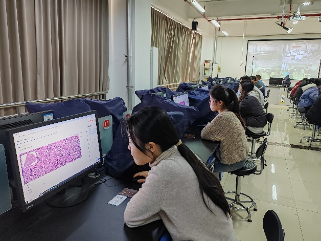 本届大赛以“守正形态之本源,创新数智之纪元”为主题,秉持“以赛促教、以赛促学、以赛促改、以赛促建”的办赛理念,设置了人体解剖学、组织学、病理学、寄生虫学、医学微生物学五个学科的赛项。全国220余所院校的1.7万余名学生参与了决赛阶段的云端竞赛。前期,通过各课程组老师精心指导和校赛选拔,共有96名临床医学、医学检验技术等专业的学生获得参赛资格,分别参与5个赛项的竞争。在比赛过程中,每个赛项的学生均需在30分钟内完成40-60道读图题。这些题目不仅考查学生对人体结构和疾病特征的辨识能力,更检验学生将理论知识与形态特征相结合的能力以及逻辑和临床思维能力。