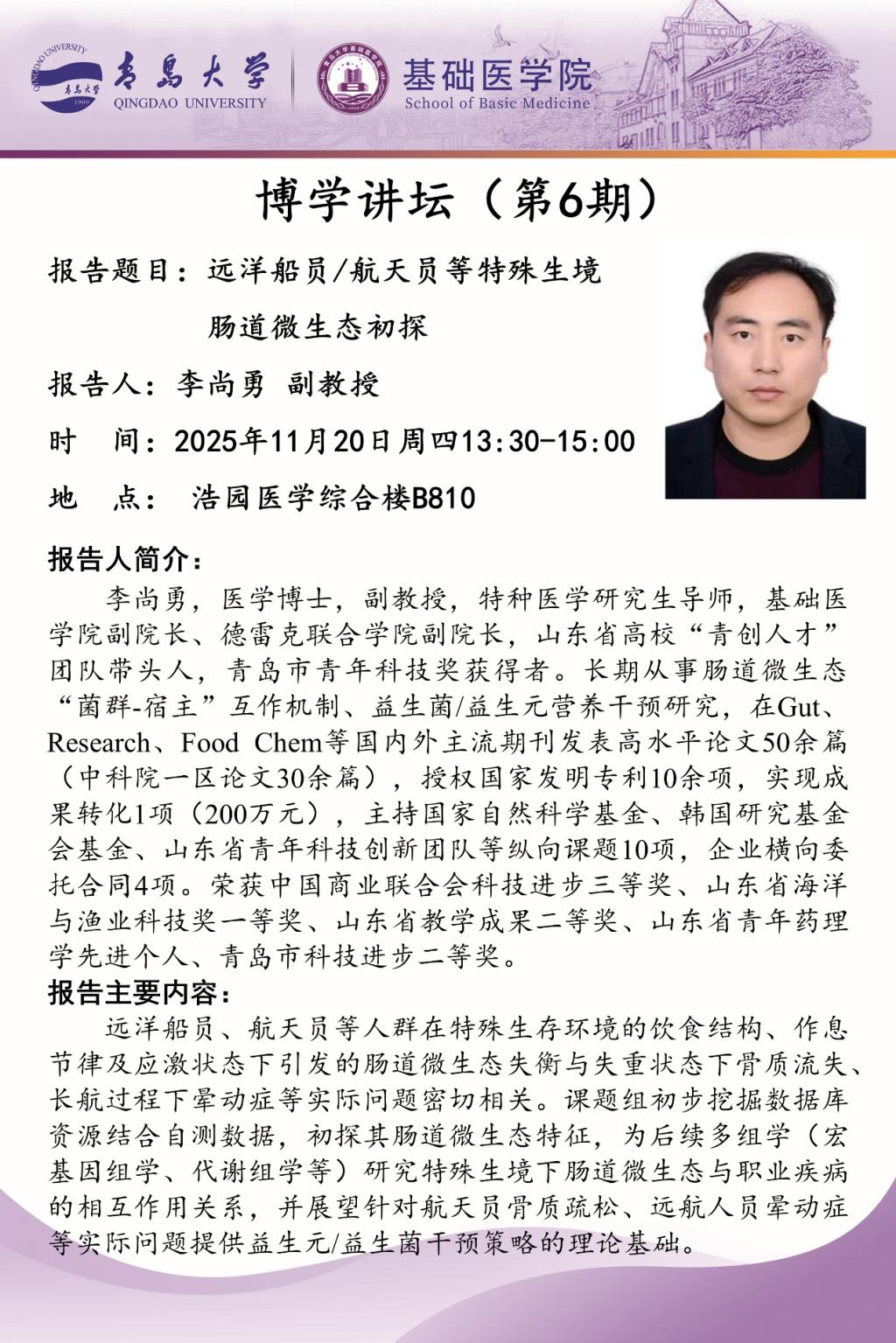 本次讲座以“远洋船员/航天员等特殊生境肠道微生态”为主题,李尚勇副教授结合自身课题组多年研究成果,围绕特殊环境人群的健康保障问题展开深入分享。他指出,远洋船员、航天员等群体长期处于失重、密闭、作息不规律等特殊生存环境中,其饮食结构变化、应激反应等因素易引发肠道微生态失衡,而这种失衡又与骨质流失、晕动症等典型职业健康问题存在密切关联,这一研究方向兼具理论深度与实践意义。