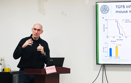 本期讲坛聚焦肌萎缩侧索硬化症(ALS)的创新药物研发,以“Dysregulated TGF-β Signalling in ALS: Rationale and Preclinical Development of NVP-13”为主题,Dr. Dyczynski结合自身在反义寡核苷酸(ASO)及小分子治疗药物领域的研究积累,围绕ALS的病理机制与创新候选药物NVP-13的研发展开深入解析。他指出,TGF-β信号的长期过度激活是ALS中神经炎症、胶质细胞增生及类纤维化病理改变的关键驱动因素之一,而NVP-13作为一款靶向调节异常TGF-β信号的ASO药物,为ALS及相关纤维化疾病的治疗开辟了新方向,兼具重要的临床转化价值与学术研究意义。