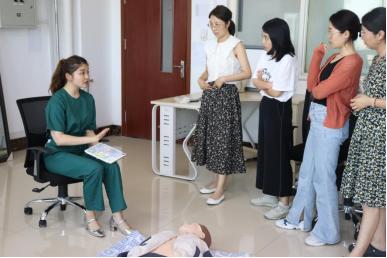 最后临床培训中心的王璐老师对参加活动的青年教师进行了临床技能培训。培训以“理论+示范+实操”的形式展开,重点讲授了心肺复苏、“AED”(自动体外除颤器)的使用及海姆利克急救等临床技能,并进行了模拟演练。