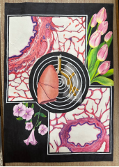 作品说明:肺是人体中非常重要的器官,作品的正中央是一个肺的轮廓,人体的左肺有三叶,在这三叶中是肺的显微结构,左肺整体是彩色的,而右肺则是黑白的,两者对比能更凸显吸烟等不良活动对于肺部的损伤,借此呼吁吸烟有害健康希望大家少吸烟不吸烟。作品左上角是终末细支气管横断面的模式图,右上角是肺泡的模式图,左下角和右下角均为肺部显微结构图,从微小的角度,介绍肺的结构。 |
