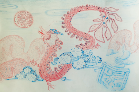 作品说明:本图以中国传统神话中的龙为载体,巧妙地将人体的各种器官和组织结构融入其中,创造出一种独特的艺术形式。龙珠由肝小叶构成,代表着肝脏的代谢和解毒功能;龙背由骨骼肌组成,象征着人体的力量和运动能力;龙腹则由平滑肌构成,体现了内脏器官的柔软和灵活性。龙角、龙眼、鬓毛、龙尾以及祥云都由不同的组织结构组成,胃底腺、纤维细胞、小肠绒毛、十二指肠腺和腺泡等,各具特色和象征意义。整幅作品既展现了人体器官的微观世界,又呈现出中国传统文化中龙的神秘和力量,富有创意和想象力。