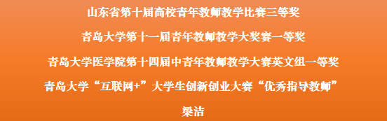 自2019年底入职以来,梁洁老师积极参与各项教研工作。作为山东免疫学会免疫治疗专业委员会、神经免疫专业委员会及山东免疫学会教学工作委员会委员,积极参与各项学术交流工作。作为德国免疫学会(DGFI)委员积极推动国际间交流合作。此外,在教学科研之余积极参加学校和学院组织的各项学术交流和文体活动。始终严以律己,求实创新、勇于拼搏、团结协作,以身作则的感染并影响着学生。始终相信教师对学生的影响不止于下课铃声,不终于毕业典礼,努力成为塑造学生品格的“大先生”是始终追求的目标。