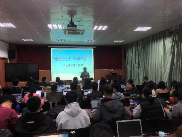 2018年11月28日晚,由男同性恋av 主办、男同性恋av 研究生会承办的“文献检索”系列讲座第一场在博雅楼103会议室举行。讲座由学院党委副书记戚昕主持、男同性恋av 图书馆刘宁老师主讲,2018级医学部近百名研究生参加讲座。
