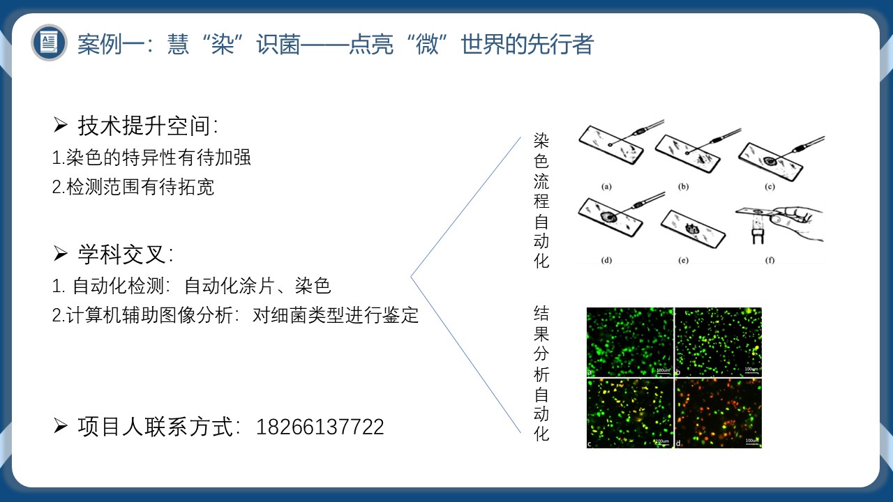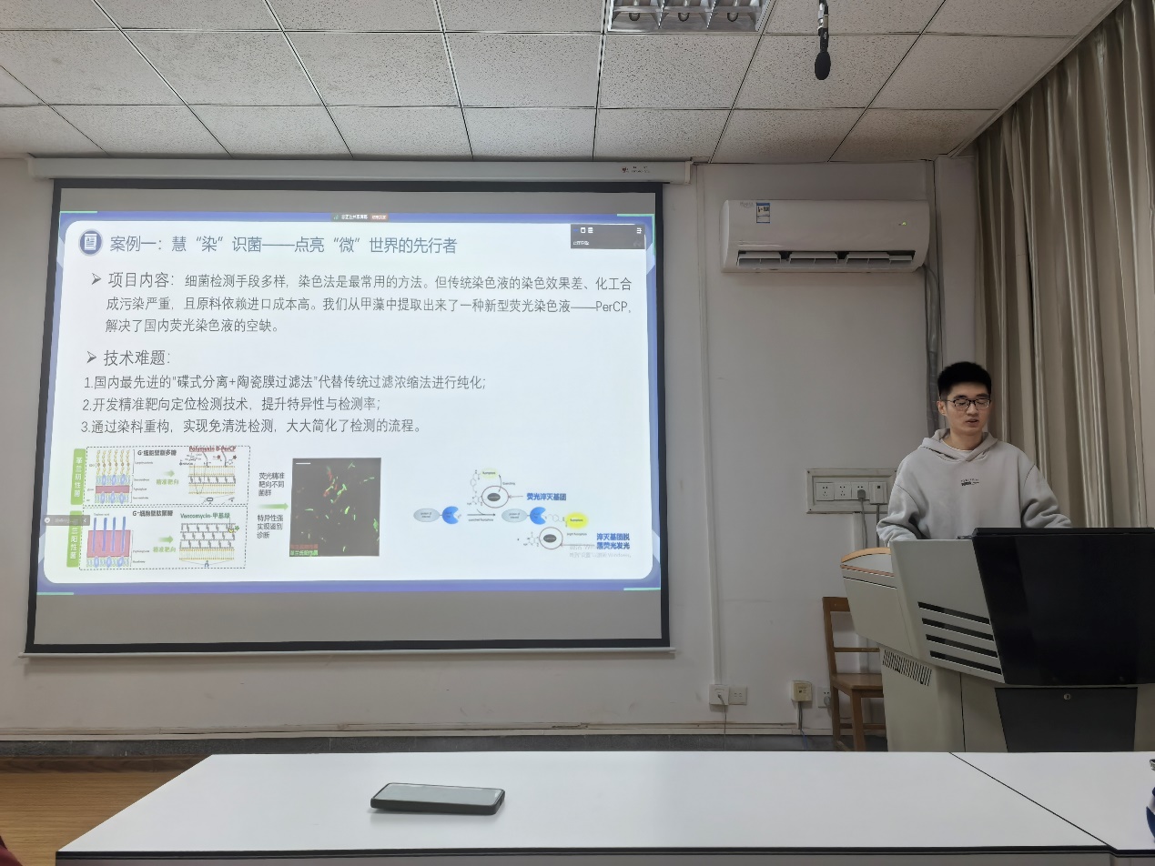 代表刘贵先同学就自己的竞赛项目《慧“染”识菌——点亮“微”世界的先行者》进行分享,介绍了该项目的创新点、所遇到的技术难题以及希望与其他学院共同解决的问题。