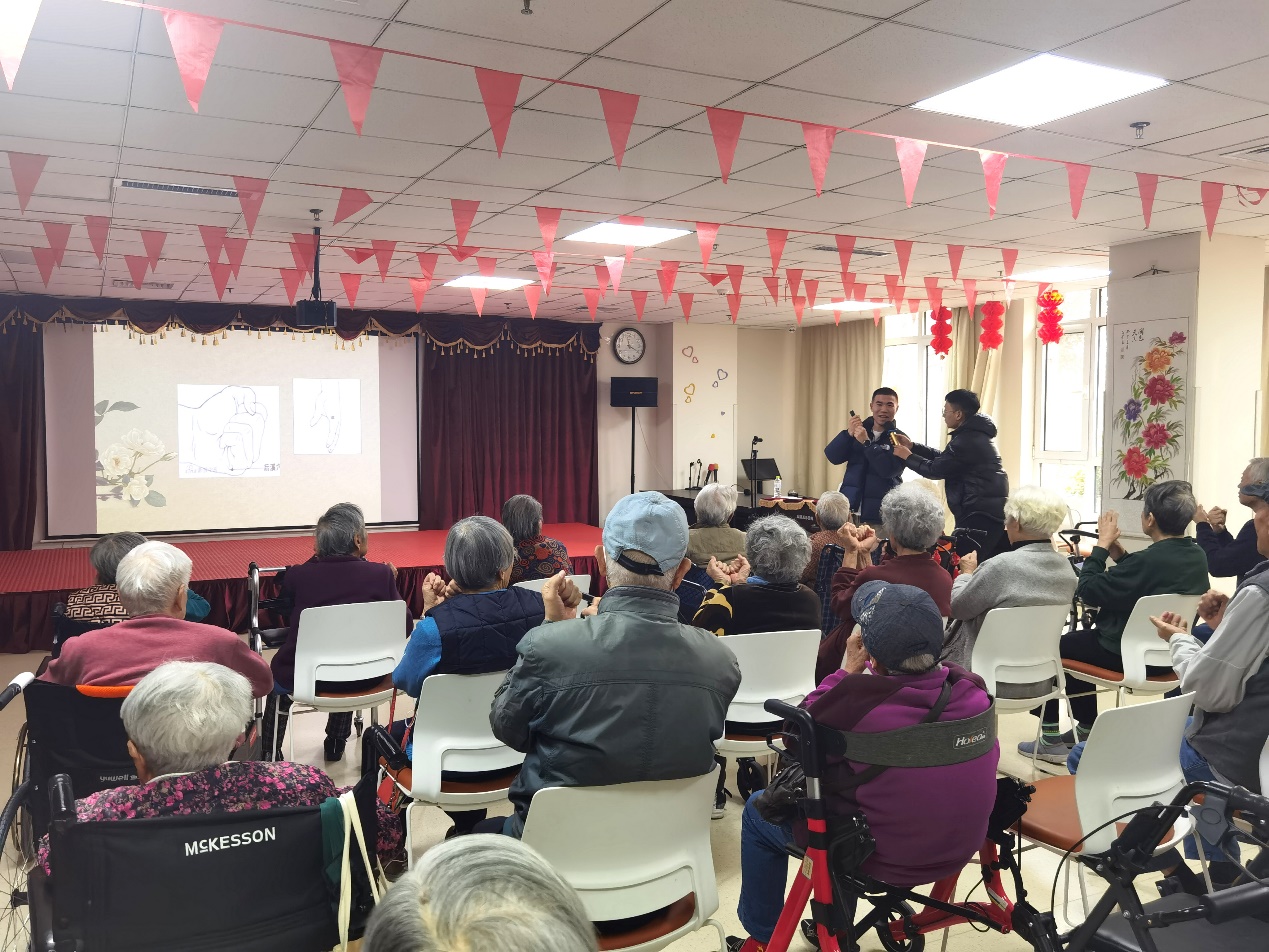 在“乐韵暖心,筑梦歌声”环节,四位学生志愿者以一曲曲悠扬的歌声,为老人们的心灵送上了温暖的慰藉。他们精心编排,将京剧的醇厚韵味与现代音乐的时尚元素巧妙融合,不仅展现了中华文化的深厚底蕴与多元魅力,也触动了在场每一位老人的心弦。老人们随着歌声轻轻拍掌,轻声跟唱那些耳熟能详的旋律,仿佛思绪穿越时光,回到了青春洋溢的往昔岁月。