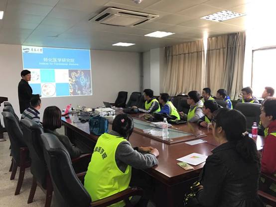 2016级华大基因创新班的20名同学在辅导员孙帅帅和班主任张丽老师的带领下,于3月31日上午赴登州路转化医学研究院进行参观和学习。王胤院长和刘英主任热情地接待了老师和同学们。王院长为同学们介绍了转化医学研究院目前的研究方向、平台建设、研究成果以及承担项目,希望同学们能够尽早树立明确的目标,调整好自己的时间结构,有的放矢地进行专业课的学习,尽早开展实验项目,为日后的科研之路打下基础,并希望优秀的同学能够考取转化医学的研究生。