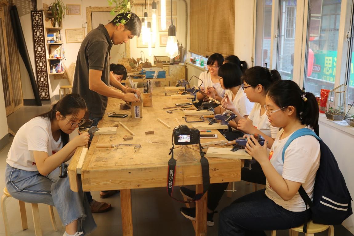 7月28日下午,志愿者们参观了木艺作坊。说到木刻,除了刨子、锛这些传统的工具外,榫卯结构是木刻中的一个重要的元素,不用铁钉,不破坏木质本身生长结构,依靠测量、切割、打磨、安装等纯手工制作,在相连接的两构件上采用凹凸结合的处理方式,完成一件家具。讲求天然、无添加,榫卯结构可以说是古人智慧的结晶。