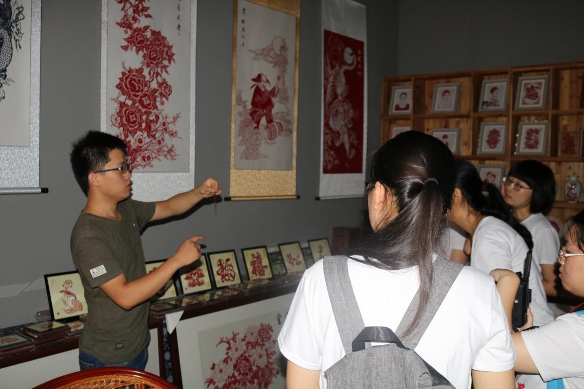 7月28日上午,志愿者们在剪纸老师李老师的带领下参观了布帛剪纸和十二生肖等系列剪纸。