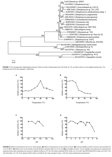 壳聚糖一般可以通过化学、物理、电化学和酶法生产。因为无污染物和生产过程的易控制性,使用壳聚糖酶生产壳聚糖相对于其他方法,优越性更为突出。该文章报道了一种新型冷适应的壳聚糖酶CsnS,该基因是从深海细菌Serratiasp. QD07中克隆得到。该酶水解壳聚糖聚合物以产生二糖和三糖作为主要反应产物。另外,课题组还建立了一种高效的发酵和纯化方法,并对CsnS的生化特性进行了表征。这些结果使CsnS成为壳聚糖工业生产的潜在候选材料。
