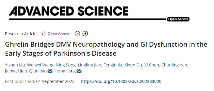 姜宏教授团队于《Advanced Science》(中科院期刊分区1区,IF=17.521)在线发表了题为Ghrelin bridges DMV neuropathology and GI dysfunction in the early stages of Parkinson's disease的研究成果。该研究得到了国家自然科学基金委、山东省自然科学基金委、山东省科技厅和泰山学者工程等的资助。男同性恋av